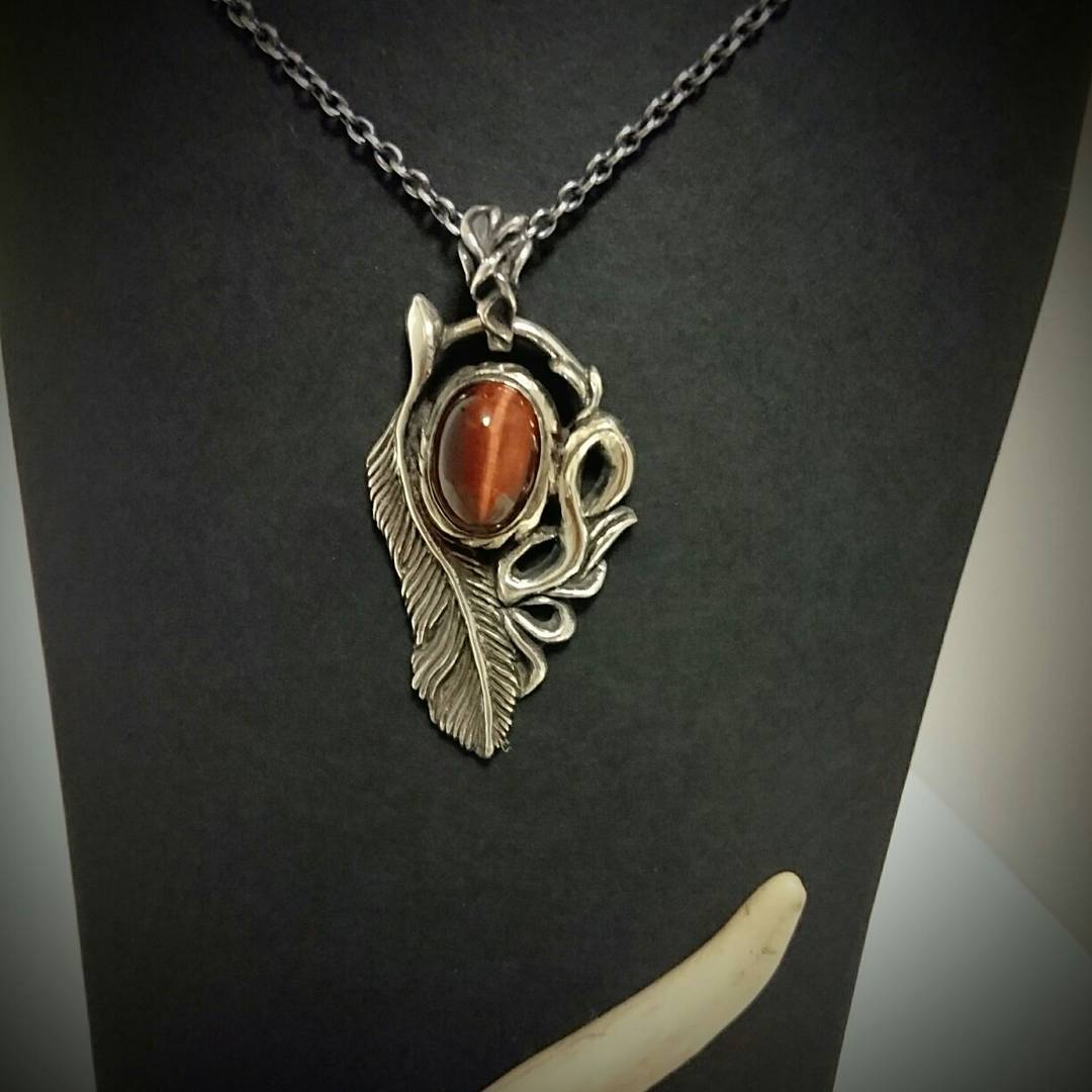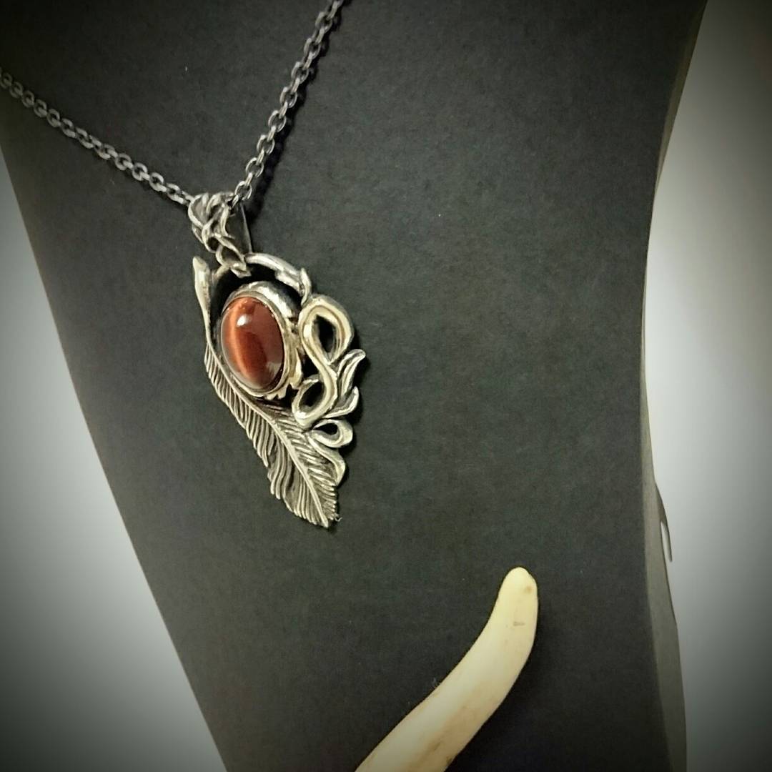 天然石レッドタイガーアイにフェザーをあしらえたネックレスです。